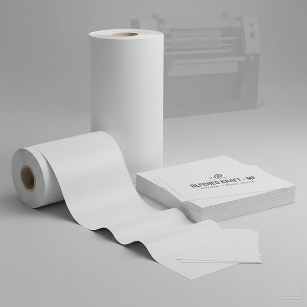 Machine finished (MF) bleached kraft paper with a smooth, uniform surface for printing, wrapping, and food packaging. Combines strength with brightness for clean, high-end packaging appeal.
