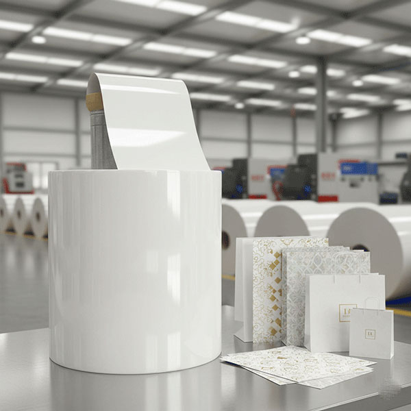 Glossy, high-quality machine glazed (MG) bleached kraft paper designed for gift wraps, premium bags, and coated packaging. Offers superior whiteness, shine, and print performance.